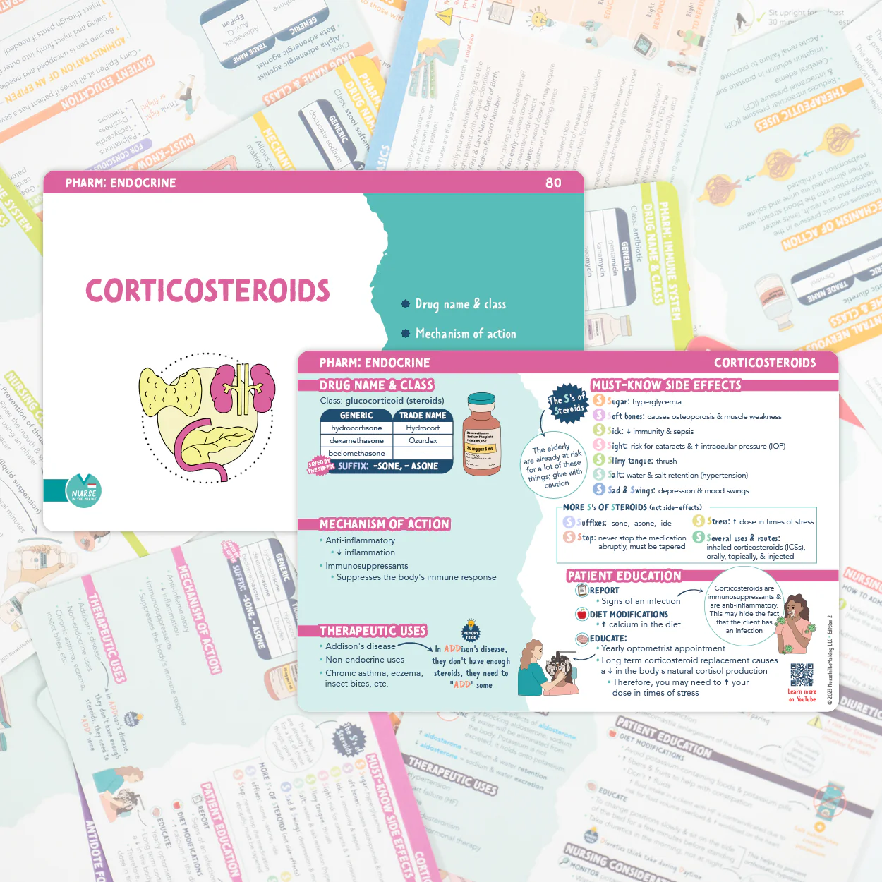 150+ of the most common medications. Includes medication class, therapeutic uses, generic & brand name, antidotes, & therapeutic ranges.